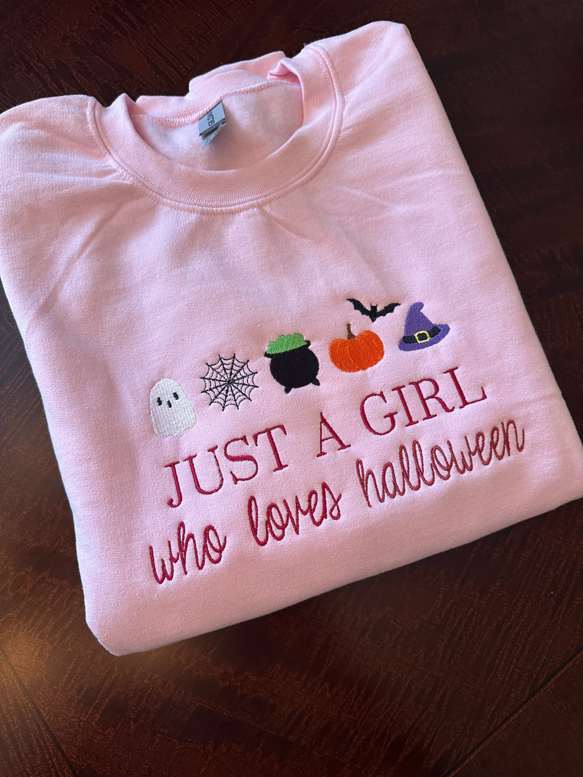 Show off your spooky side with this cozy embroidered sweatshirt that celebrates your love for all things Halloween! 👻 Featuring the phrase "Just a Girl Who Loves Halloween" and embroidered icons — a ghost, spiderweb, cauldron, pumpkin, bat, and witch hat — this sweatshirt is the perfect mix of cute and festive. Ideal for pumpkin patch visits, trick-or-treating, or just sipping cider on a chilly October day!